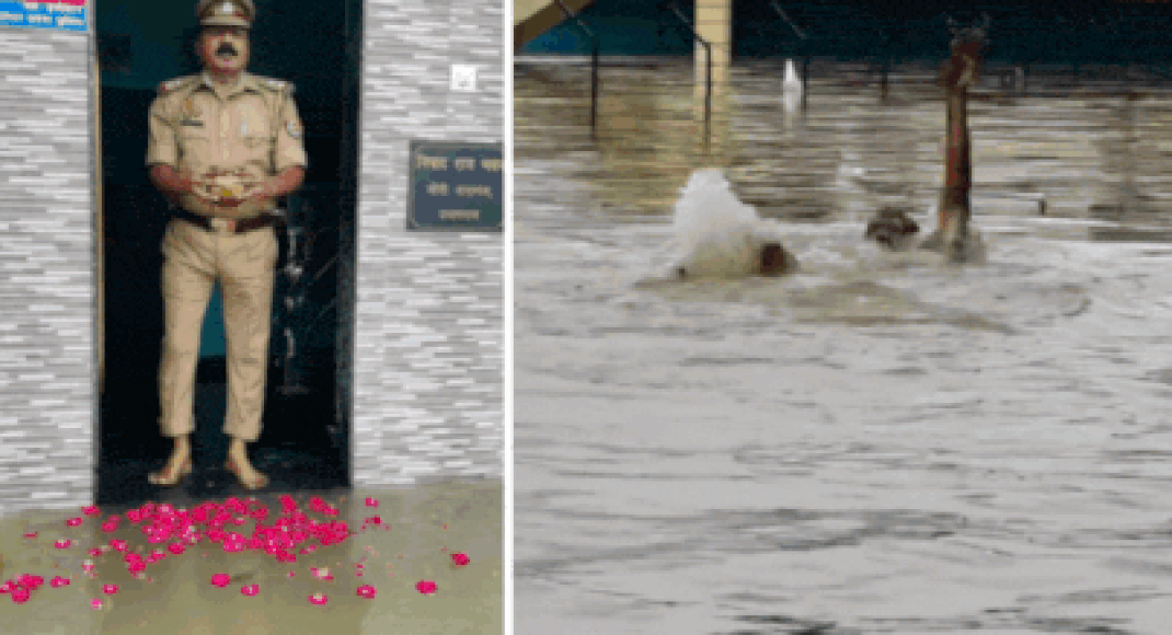. नवी दिल्ली: प्रयाग्राजमधील एका पोलिस अधिका of ्याचा व्हिडिओ त्याच्या घराबाहेर पूर पाण्याची उपासना करीत आहे. उत्तर भारतातील काही